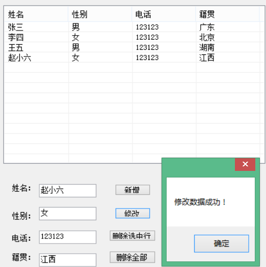 ListView是用于显示数据的,先在窗体中拉一个lisview控件,还有一些新增、修改、删除、查询按钮和文本框,控件名称为listview,按钮为btnInsert,btnUpate,btnDeleteOne,btnDelete,btnSelect,文本框的名称为txtName,txtSex,txtPhone,txtAddress,设计如下图所示: