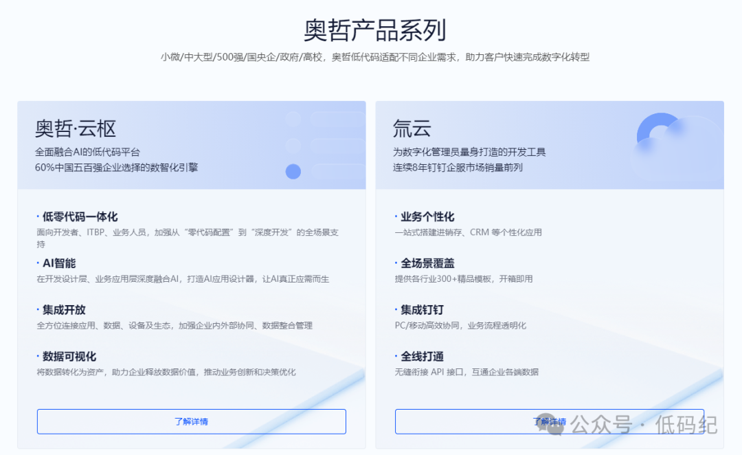 国外平台的优势是技术成熟、功能强大,缺点是价格高、本地化服务弱、对国内的政策法规(比如数据本地化)支持不够好。 2. 国内平台:懂中国业务,适合国内企业国内的低代码平台虽然发展得晚一些,但更懂中国企业的业务需求,比如对接微信、钉钉、企业微信,满足数据本地化、等保合规要求,还有本地化的服务团队,响应速度快。 国内的低代码平台主要分三类:原生低代码厂商,传统软件大厂平台和公有云厂商平台。 (1)原生低代码厂商:原生架构,可以定制复杂功能这些原生低代码厂商的共同特点是专注、灵活、创新,他们不断推动着低代码技术的发展和成熟。
