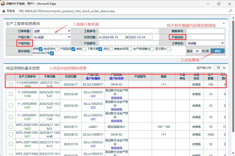 弹出界面后,按图操作:选择订单来源,然后点击查询,点击对应的物料信息。