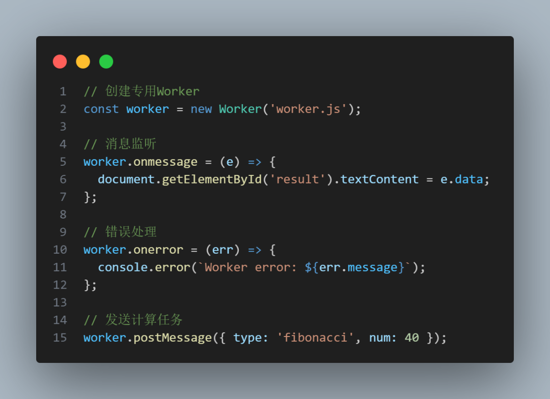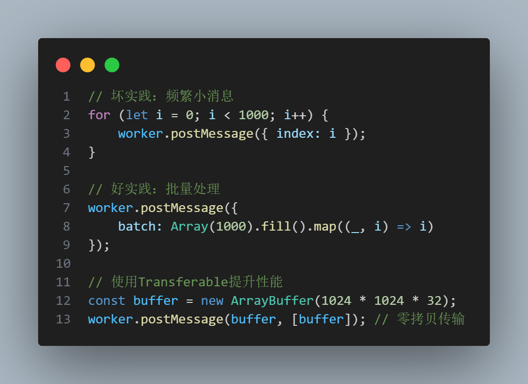 结论: 虽然总耗时相近,但 WebWorker 将主线程阻塞时间降低了 99.8%