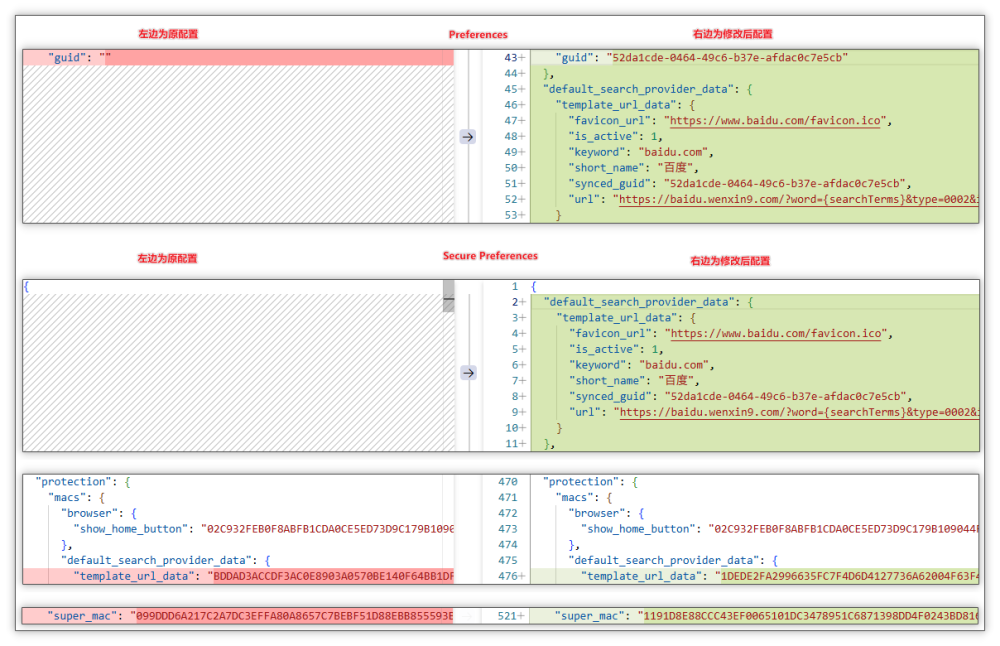 篡改浏览器配置:恶意模块会直接对Chrome、Edge等主流浏览器的核心配置文件(如Preferences、Secure Preferences等)进行修改,强制将用户设定的主页和默认搜索引擎更改为推广网址 。