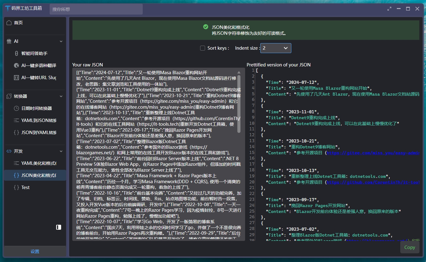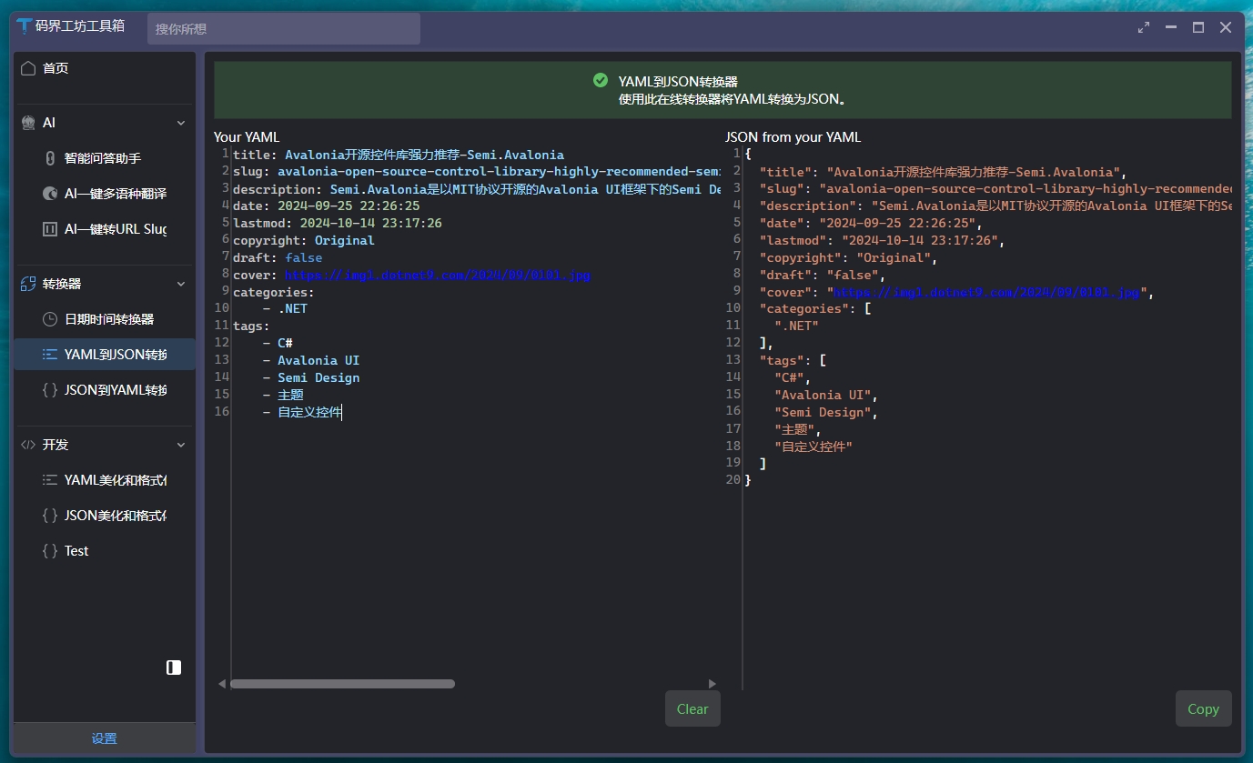 控件部分截图控件虽各有特色,但都展现出独特的魅力。简单截取几张图,让您一窥其貌: Semi.Avalonia主题库一览: Ursa.Avalonia自定义控件库一览: 实际案例分享站长公司项目使用了该控件,虽不便截图展示,但可参考站长使用 Avalonia UI 搭配该主题及控件库编写的工具CodeWF.Toolbox: 仓库:https://github.com/dotnet9/CodeWF.Toolbox 该小工具使用Avalonia+Prism 8模块化开发,AOT 发布后的文件组织结构: 其具备黑白主题,营造出不同的视觉氛围: ![]() ![]() 还实现了国际化功能,为全球用户提供便捷体验: 同时,包含实用的 Json 美化工具和 YAML 转 Json 工具,分别如下图所示: Json 美化工具 YAML转Json工具 使用经验分享
