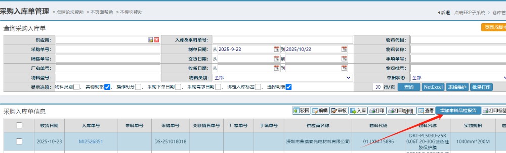![]() ![]() 答:针对这个问题可以先在“系统管理”》“物料信息维护”中找到对应物料,然后对物料信息进行编辑,如:物料厚度、主条码编号和服辅助条编码进行修改。 然后重新在“仓库管理”》“物料入库管理”》“采购入库管理”里点击查询,找到对应物料信息,在右上方重新点击“增加来料品检报告” 报告上会自动同步标准检验的结果数值 一般出现这种情况的话主要是在基础资料栏位填写好就能带出,除非当时在编辑和修改了物料信息后没有重新生成报告(因为之前的报告是以修改前的物料信息) 该文章在 2025/10/23 13:51:01 编辑过 |